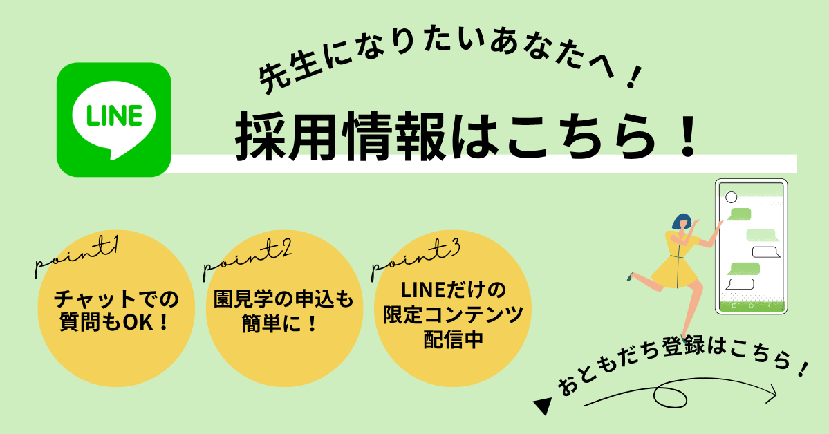 認定こども園せんだい幼稚園(採用)のLine公式アカウントを作成しました。先輩のインタビューなども掲載しています。園のことを詳しく知るきっかけにぜひご登録ください!