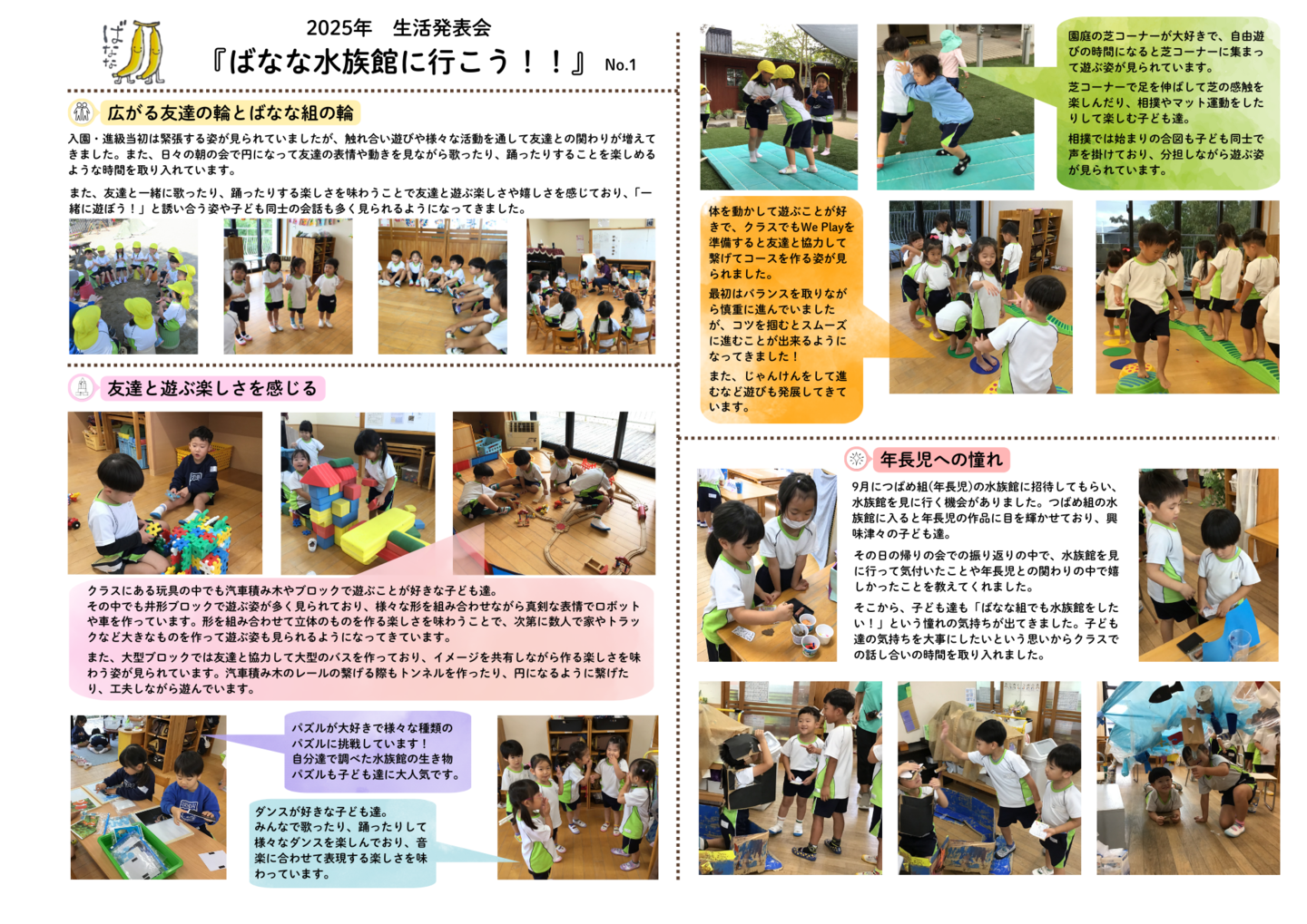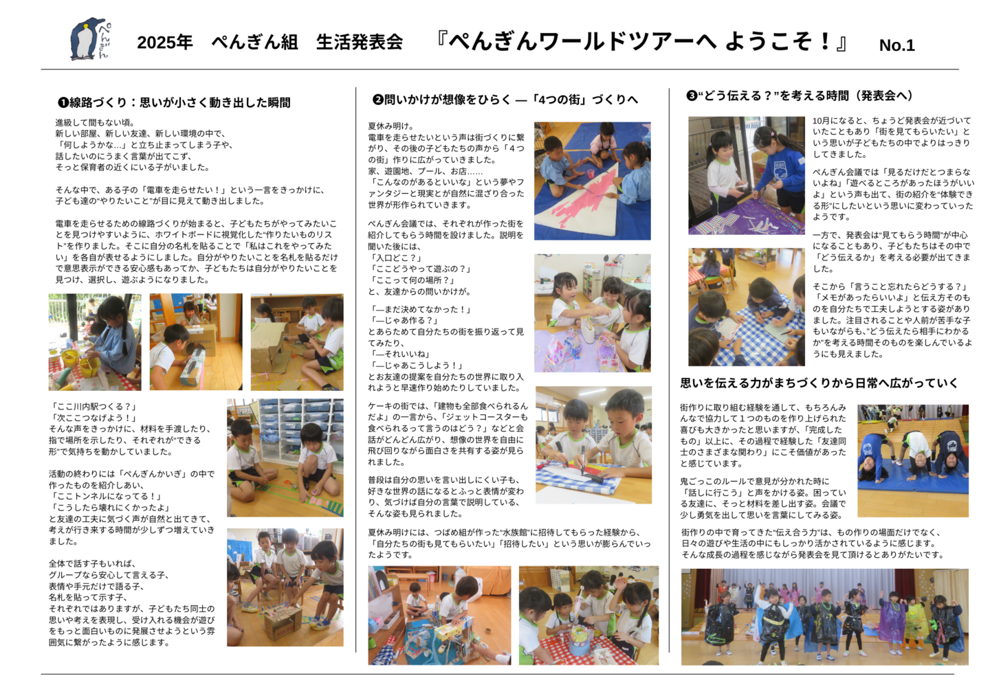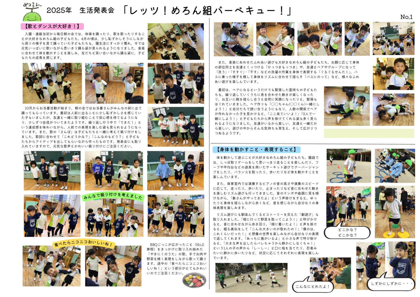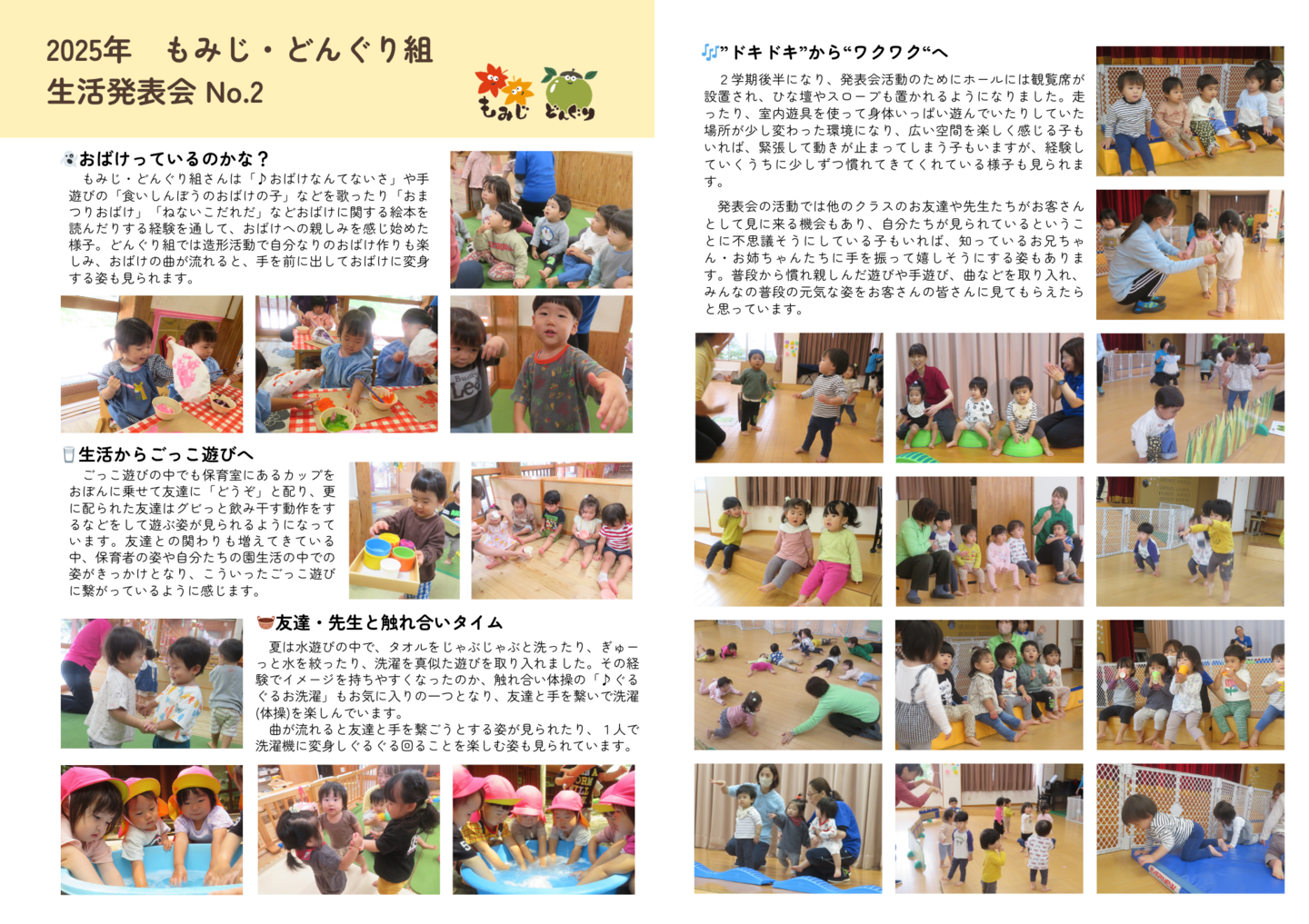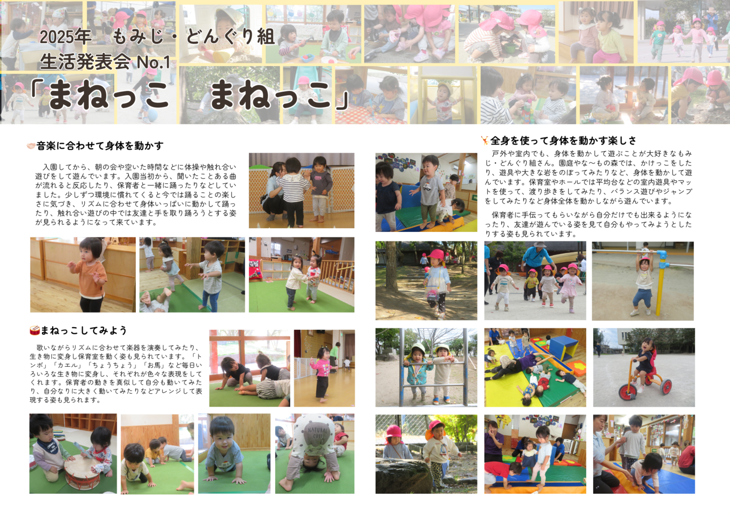 HOME | 令和7年度 生活発表会 ドキュメンテーション 0・1歳児(もみじ・どんぐり組) 2歳児(きのこ組) 2歳児(ほし組) 3歳児(いちご組) 3歳児(ばなな組) 3歳児(めろん組) 4歳児(りす組) 4歳児(うさぎ組) 4歳児(ぱんだ組) 5歳児(うぐいす組) 5歳児(ぺんぎん組) 5歳児(つばめ組)