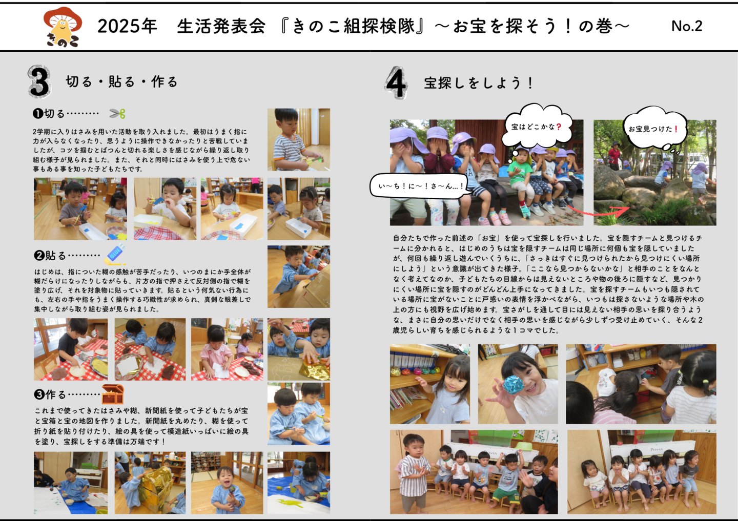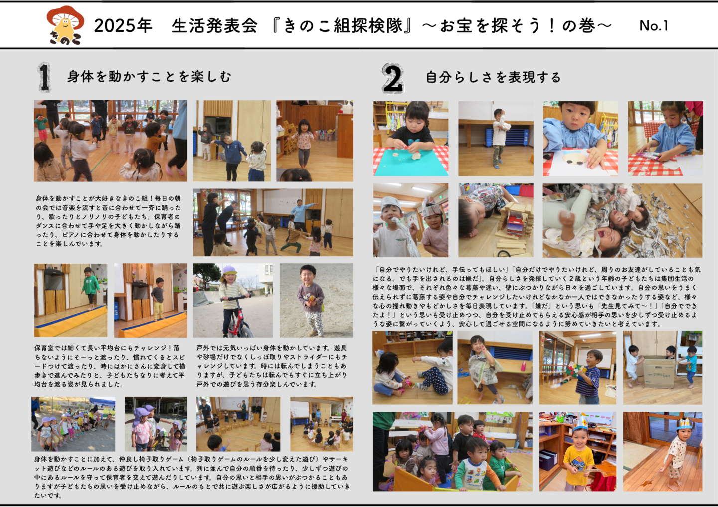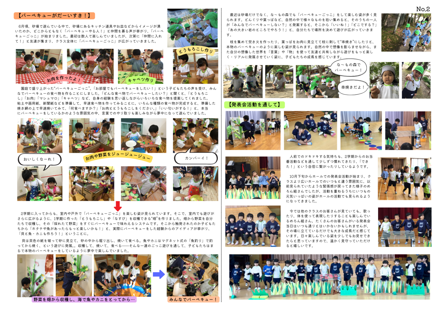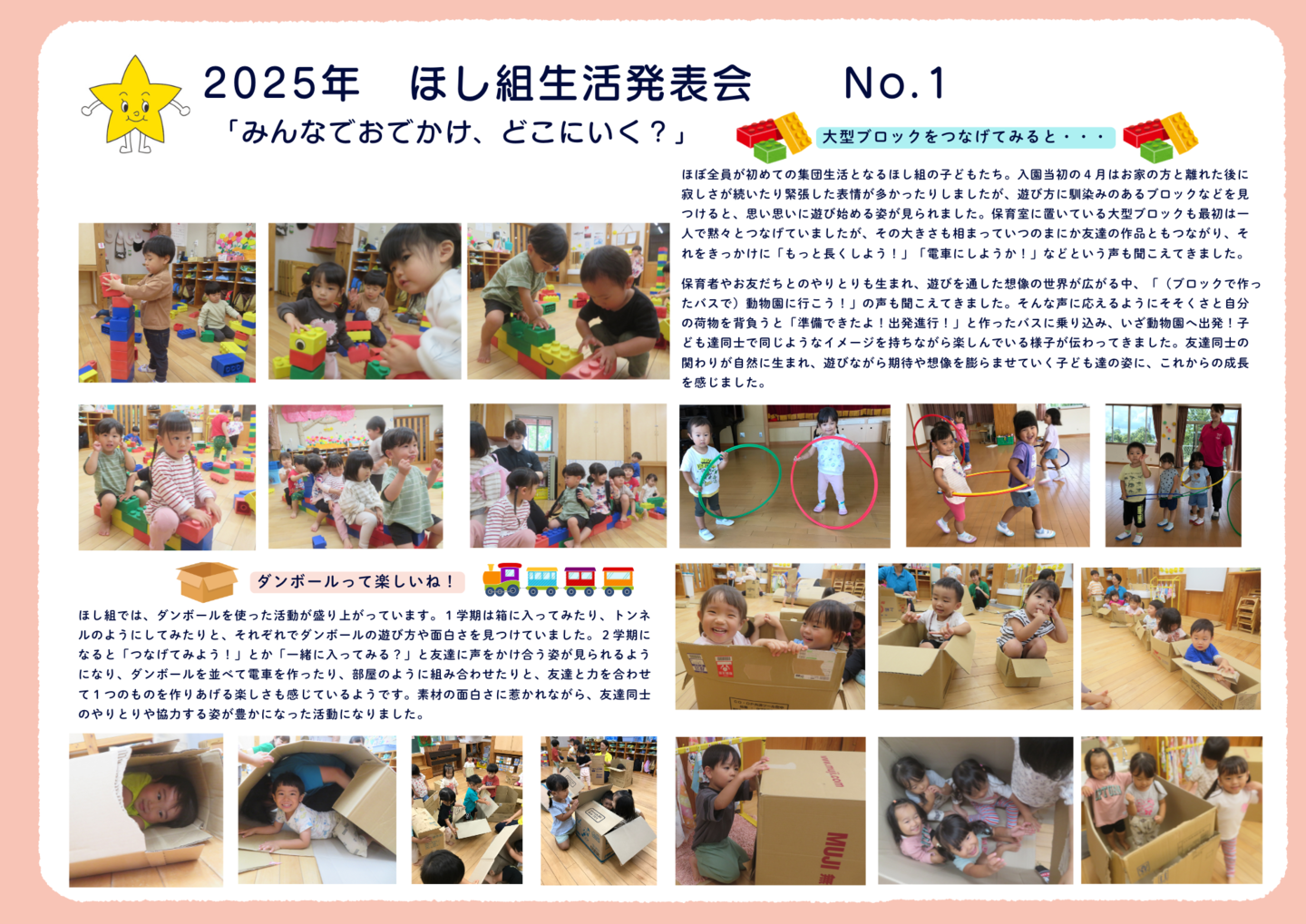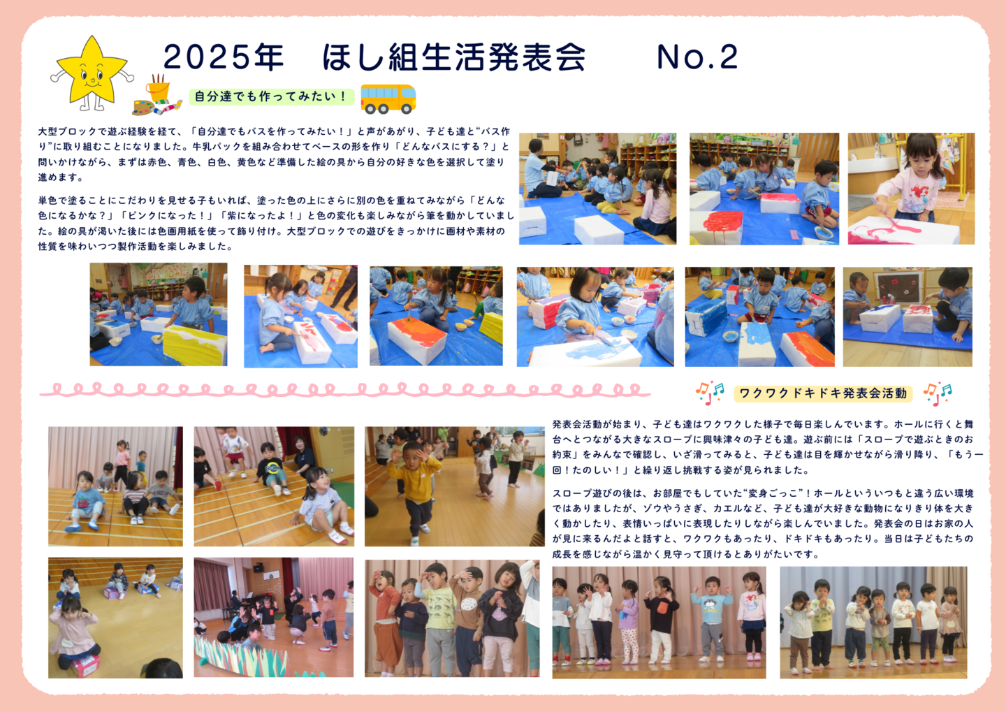 HOME | 令和7年度 生活発表会 ドキュメンテーション 0・1歳児(もみじ・どんぐり組) 2歳児(きのこ組) 2歳児(ほし組) 3歳児(いちご組) 3歳児(ばなな組) 3歳児(めろん組) 4歳児(りす組) 4歳児(うさぎ組) 4歳児(ぱんだ組) 5歳児(うぐいす組) 5歳児(ぺんぎん組) 5歳児(つばめ組)