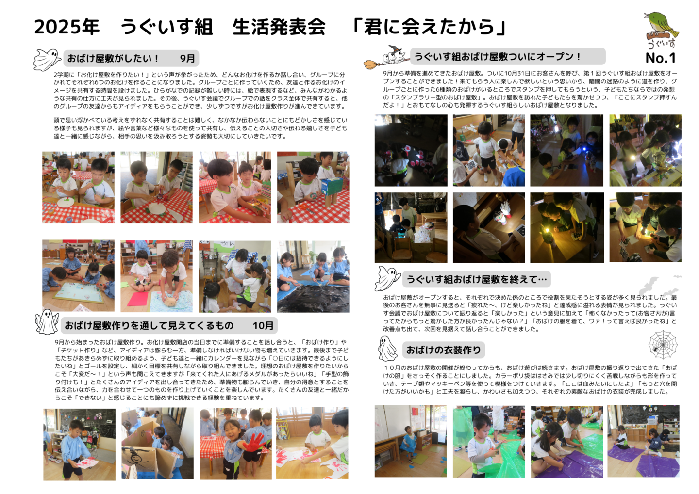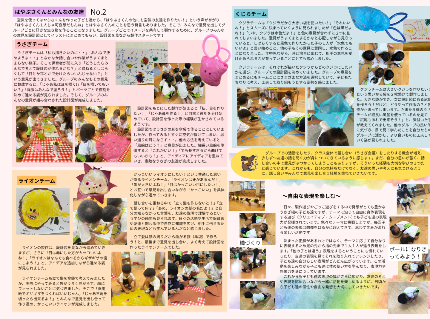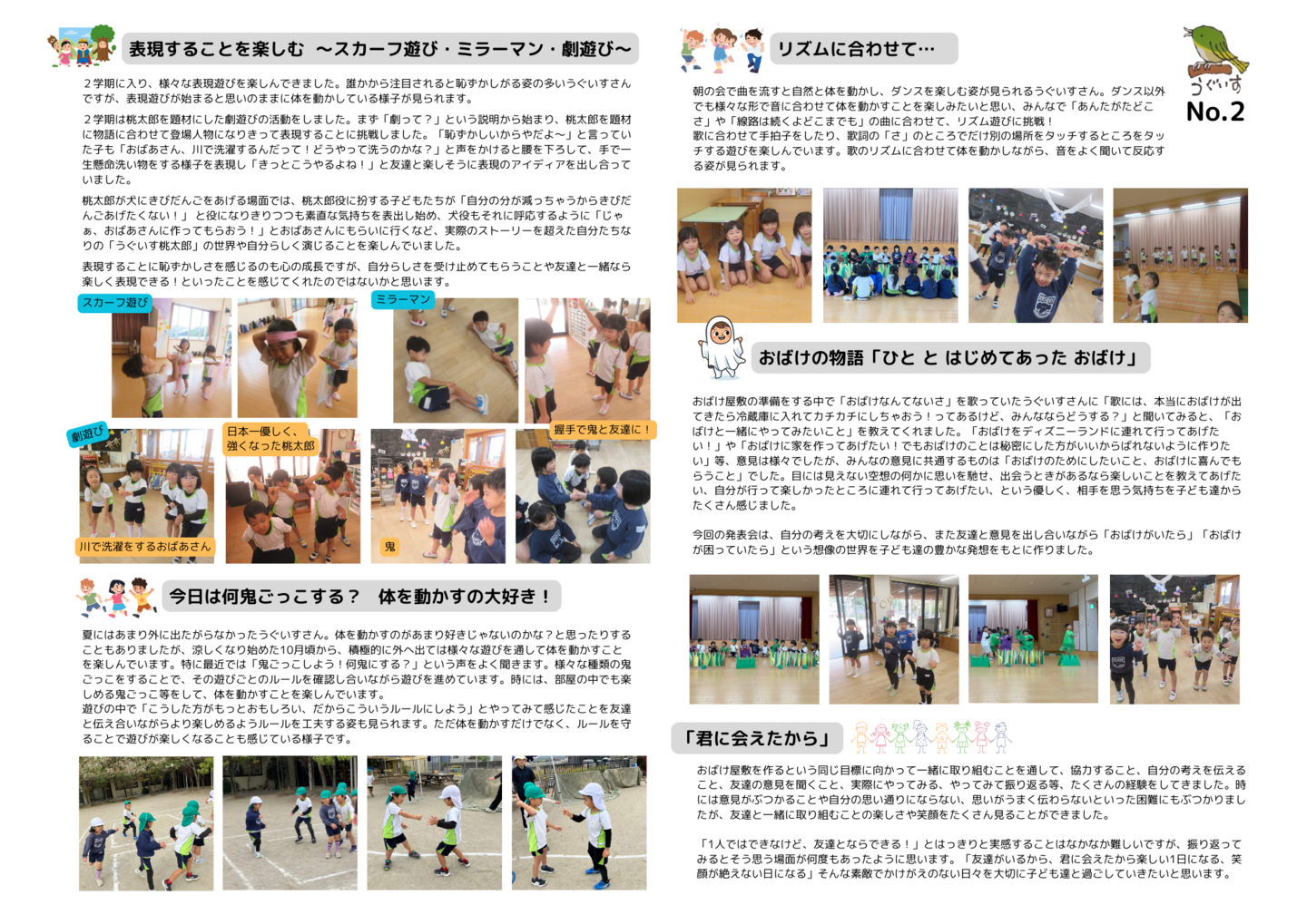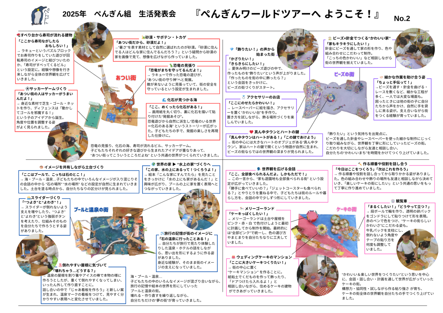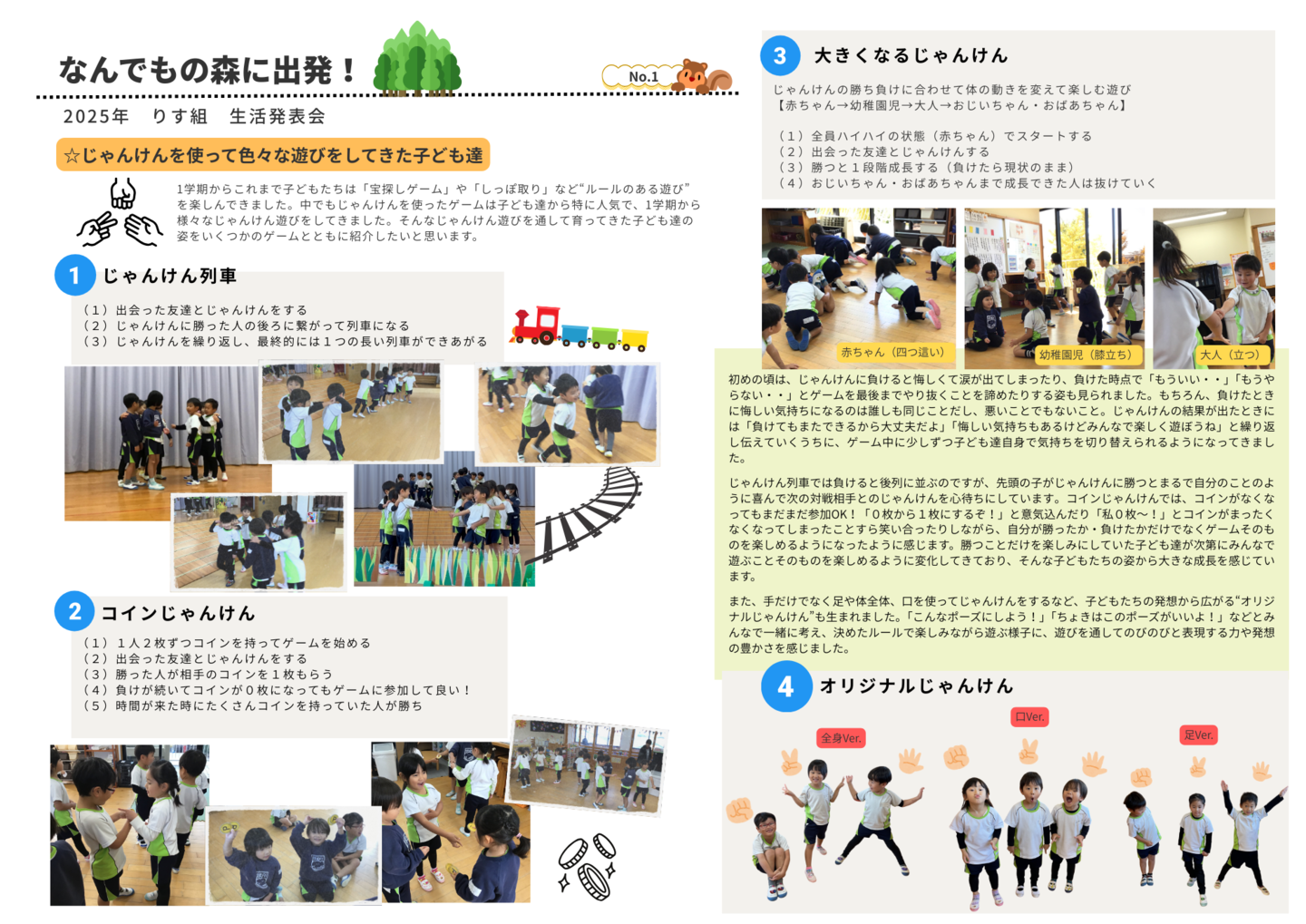 HOME | 令和7年度 生活発表会 ドキュメンテーション 0・1歳児(もみじ・どんぐり組) 2歳児(きのこ組) 2歳児(ほし組) 3歳児(いちご組) 3歳児(ばなな組) 3歳児(めろん組) 4歳児(りす組) 4歳児(うさぎ組) 4歳児(ぱんだ組) 5歳児(うぐいす組) 5歳児(ぺんぎん組) 5歳児(つばめ組)