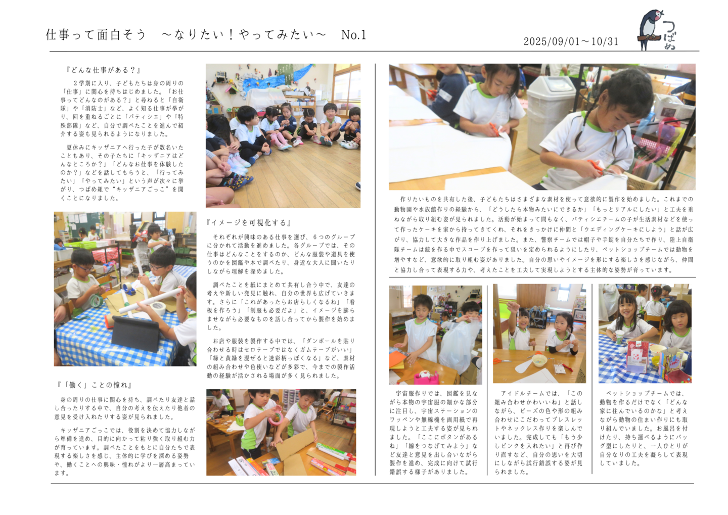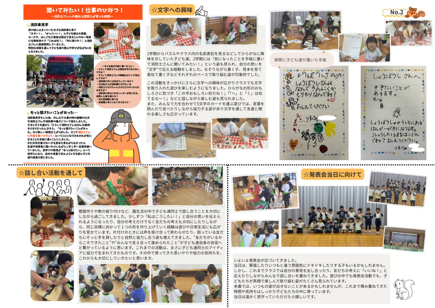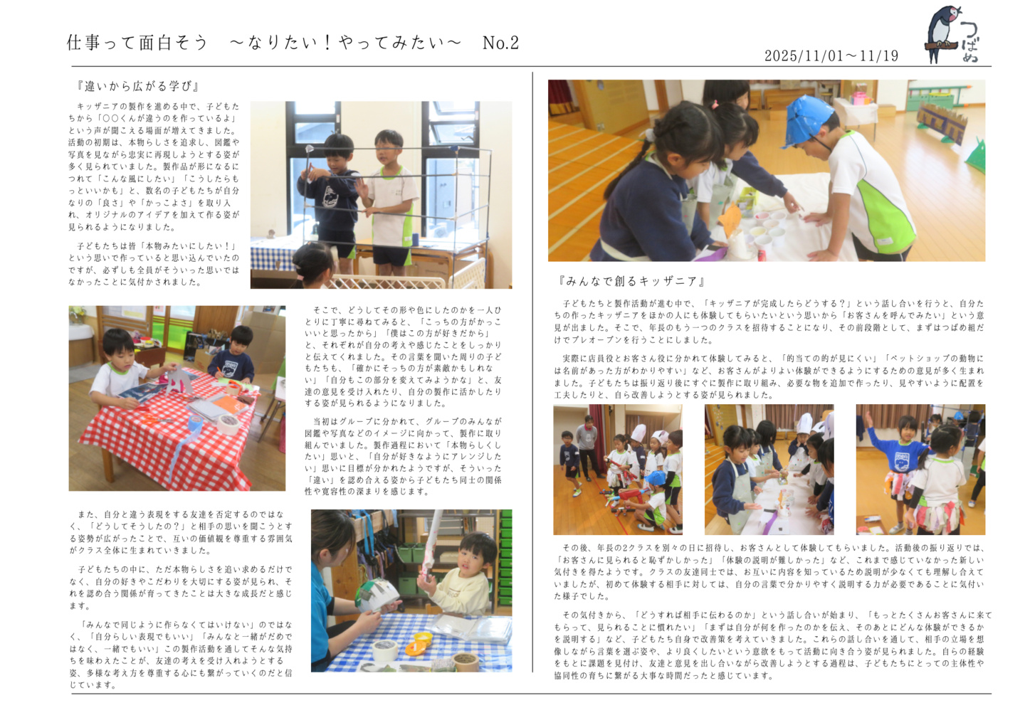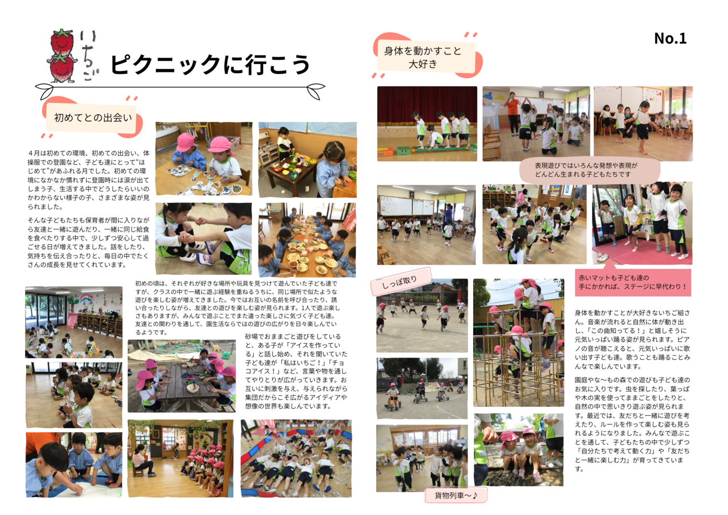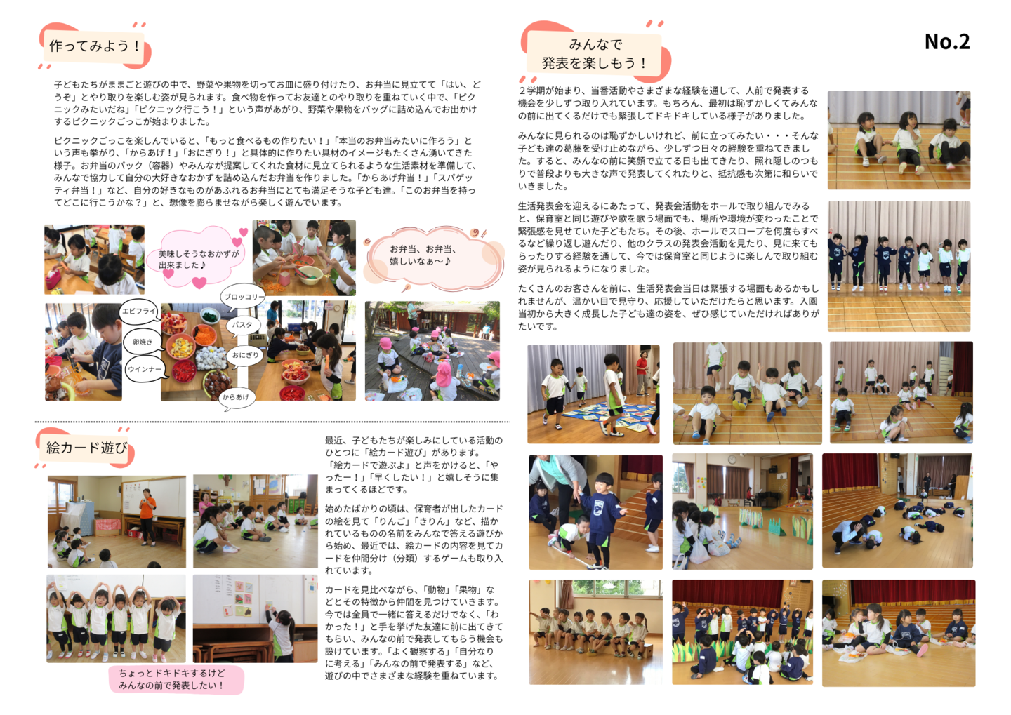 HOME | 令和7年度 生活発表会 ドキュメンテーション 0・1歳児(もみじ・どんぐり組) 2歳児(きのこ組) 2歳児(ほし組) 3歳児(いちご組) 3歳児(ばなな組) 3歳児(めろん組) 4歳児(りす組) 4歳児(うさぎ組) 4歳児(ぱんだ組) 5歳児(うぐいす組) 5歳児(ぺんぎん組) 5歳児(つばめ組)