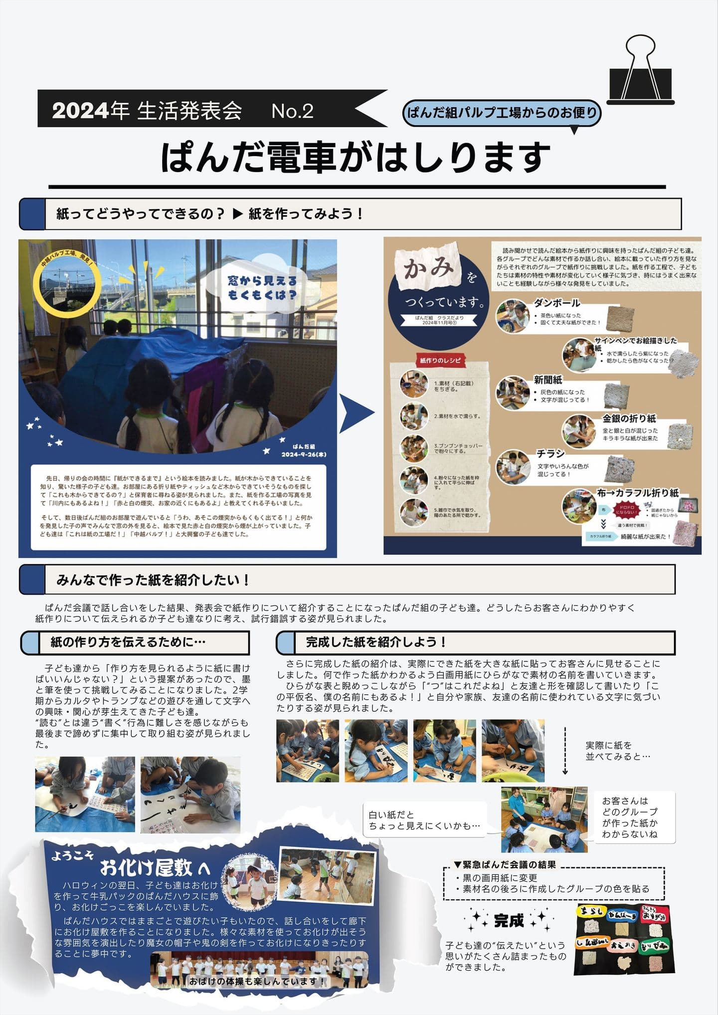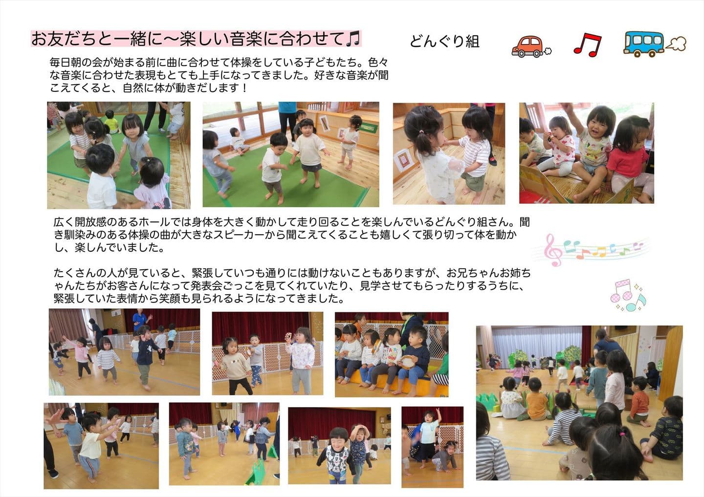 HOME | 令和6年度 生活発表会 ドキュメンテーション 1歳児(どんぐり組) 2歳児(きのこ組) 2歳児(ほし組) 3歳児(いちご組) 3歳児(ばなな組) 3歳児(めろん組) 4歳児(りす組) 4歳児(うさぎ組) 4歳児(ぱんだ組) 5歳児(うぐいす組) 5歳児(ぺんぎん組) 5歳児(つばめ組)